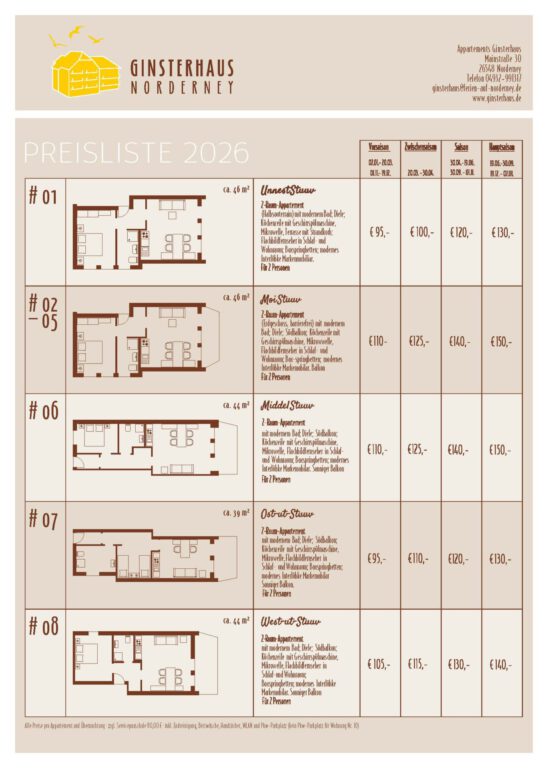 *Alle Preise pro Appartement und Übernachtung · zzgl. Servicepauschale 80,00 € · inkl. Endreinigung, Bettwäsche, Handtücher, WLAN und Pkw-Parkplatz (kein Pkw-Parkplatz für Wohnung Nr. 10)